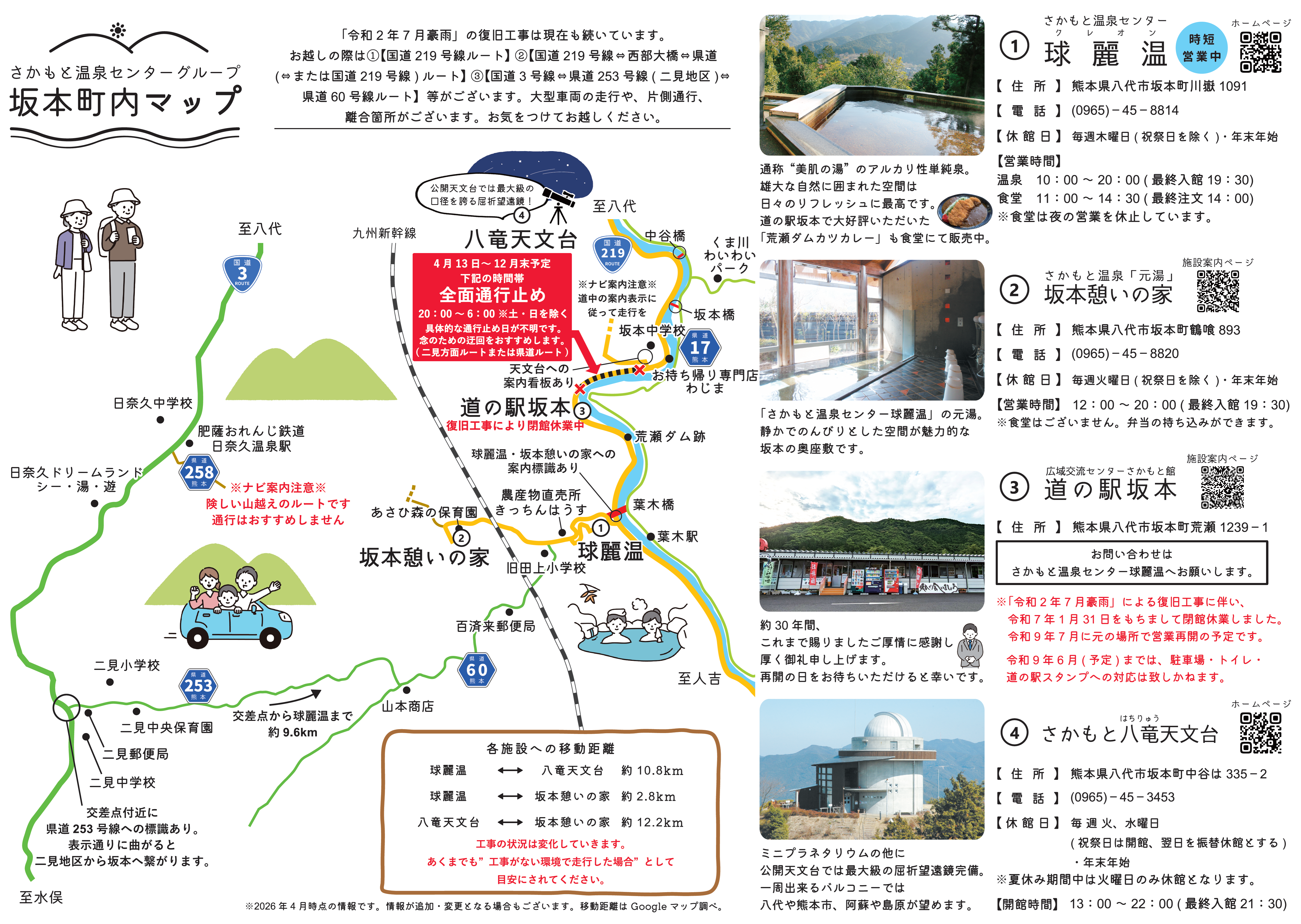 また、国道219号線が復旧工事のため車線規制(通行止めや迂回路、交互通行)や砂利道等がございますが、天文台へ至る道は走行可能ですので、安全に留意してお越しください。