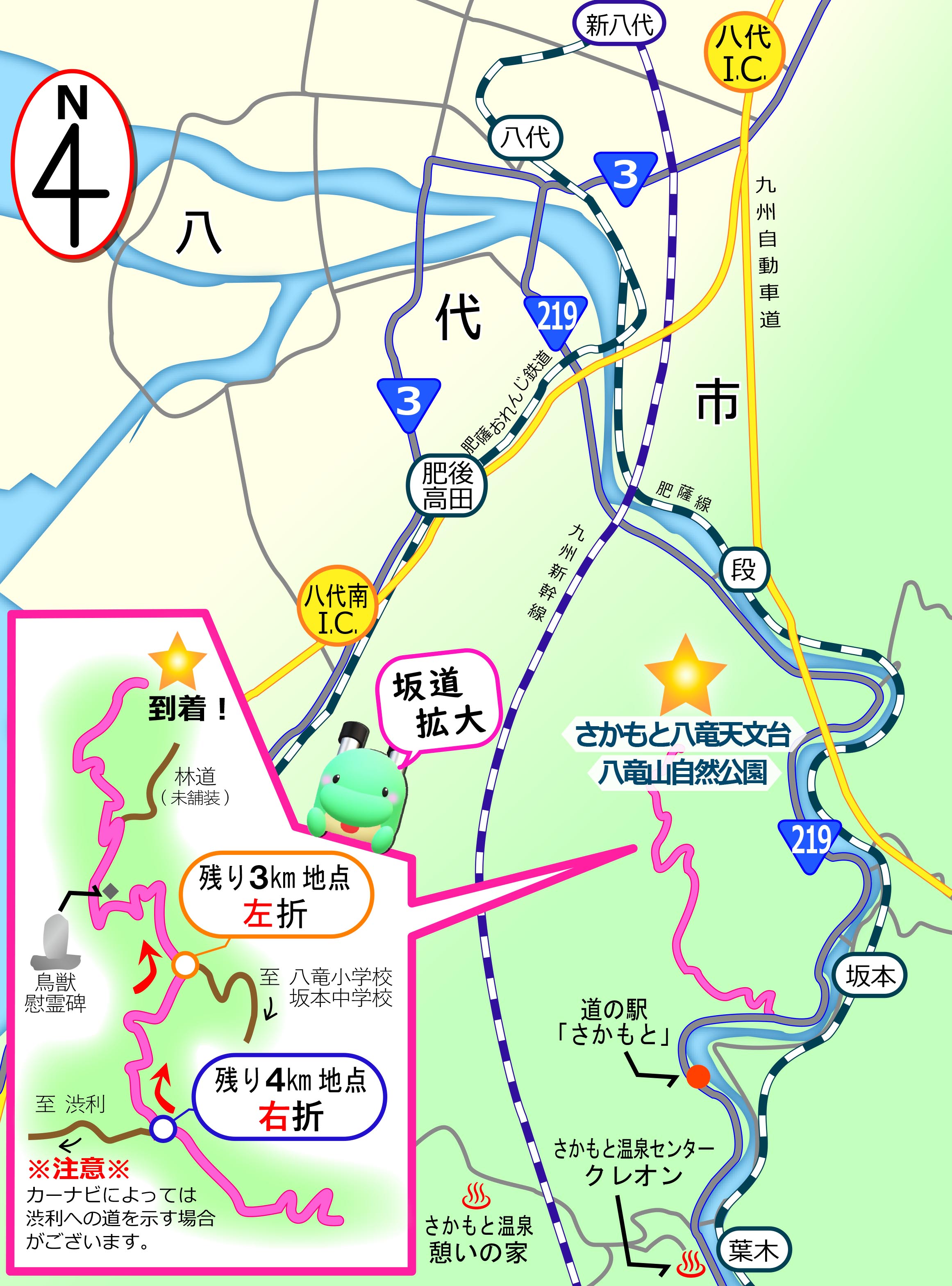 ※日奈久方面から県道258号線経由のルートは、大変険しく狭い箇所も多いため、利用をお勧めいたしません。