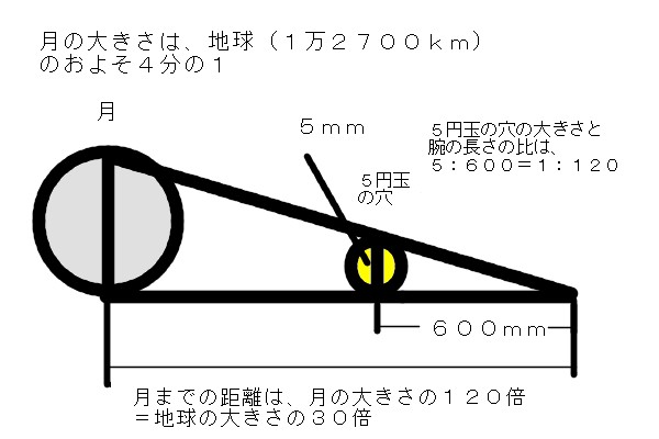 A4:アポロ11号は月面に再帰反射鏡(リトロリフレクター)という特殊な鏡(原理は自転車などに取り付けてある反射器と同じです)を置いてきました(月の上空から「投下した」のではなく、実際に宇宙飛行士が月面に降り立って設置作業を行いました)。地上からその鏡に向けてレーザー光線を発射して戻ってくるまでの時間を測定し、光の速さの秒速30万kmと掛け算して大気中の屈折率で補正してやることで月と地球との距離を非常に正確に求めることができます(レーザー測距といいます)。同様の鏡はアポロ14号や15号も設置しました。とはいえ、わたしたちはそんな大がかりな方法は使えませんので、もっと手軽なやり方を考えましょう。よく知られているように、5円玉を手に持って腕を一杯伸ばしたときの5円玉の穴の大きさは月の見た目の大きさとほぼ同じです。このとき、『腕の長さと五円玉の大きさ』と『月までの距離と月の大きさ』とは数学(幾何学)でいうところの相似の関係にあります(拡大コピーしたようなものです)。5円玉の穴の大きさを5mm、腕の長さを600mm(=60cm)とすると、両者の比率は5:600=1:120、つまり、5円玉の穴の大きさの120倍が腕の長さなので、月までの距離も月の大きさの120倍だとわかります。月の大きさは地球の大きさ(直径)約1万2700kmのおよそ4分の1なので、地球から月までの距離は120÷4で地球の大きさの30倍です。1万2700kmの30倍は38万1000kmとなり、これが地球と月との距離です。
