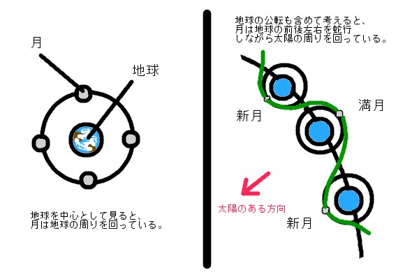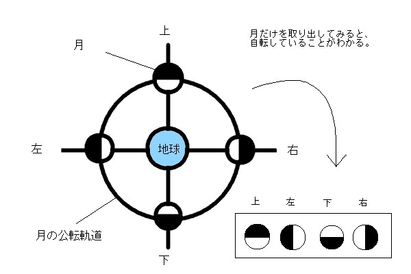 A9:いいえ、月も自転しています。自転の周期と公転の周期とが同期(シンクロ)しているので、地球に対して常に同じ面を向けているのです。わかりにくければ図を描いて確かめてみましょう。漢字の十のような×を描いて、2本の線が交わっているところを中心として同心円を描いてください。内側の円を地球とし、外側の円を月の軌道とします。×印と月の軌道が交わったところ(上下左右)に小さい○を描いてみましょう。この○が月です。月を線で二等分して地球を向いている側を白く、反対側を黒く塗ってみてください。月は常に地球の側に白い面を向けていますが、4つの月を見ていくと、白い面は月が地球の上にあるときは下向き、月が地球の左にあるときは右向き、月が地球の下にあるときは上向き、月が地球の右にあるときは左向きですよね? つまり、月の白い側は下→右→上→左と向きを変えています。これが月の自転です。ちなみに、月の自転の周期は約27日です。