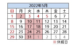 5月の開館予定日は、以下となります。※予定が変更になる可能性もございますので、ご容赦ください。